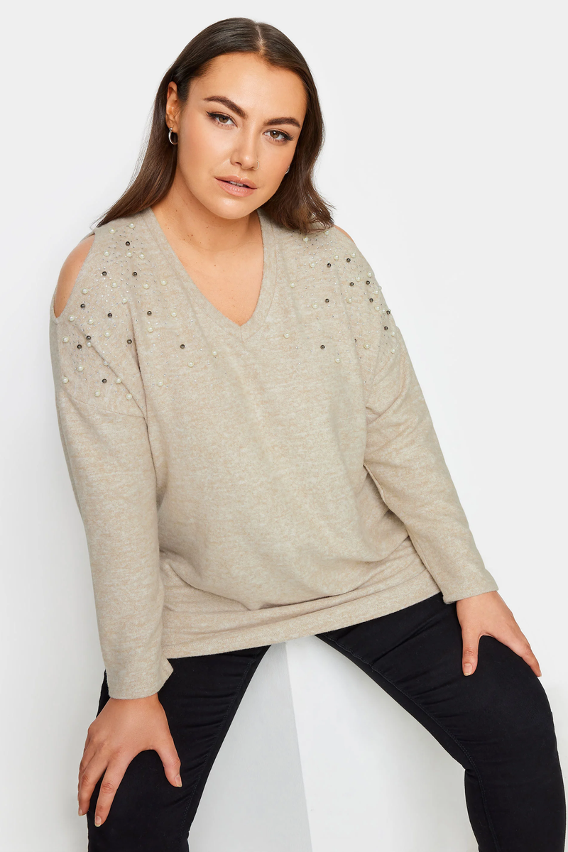 Büyük Beden V Yaka Omuz Detaylı Boncuk İşlemeli Kazak 302776