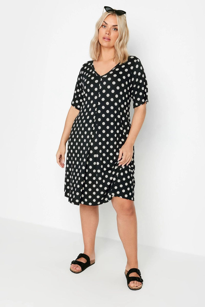 Büyük Beden V Yaka Önü Pliseli Puantiye Desenli Kısa Elbise 303167