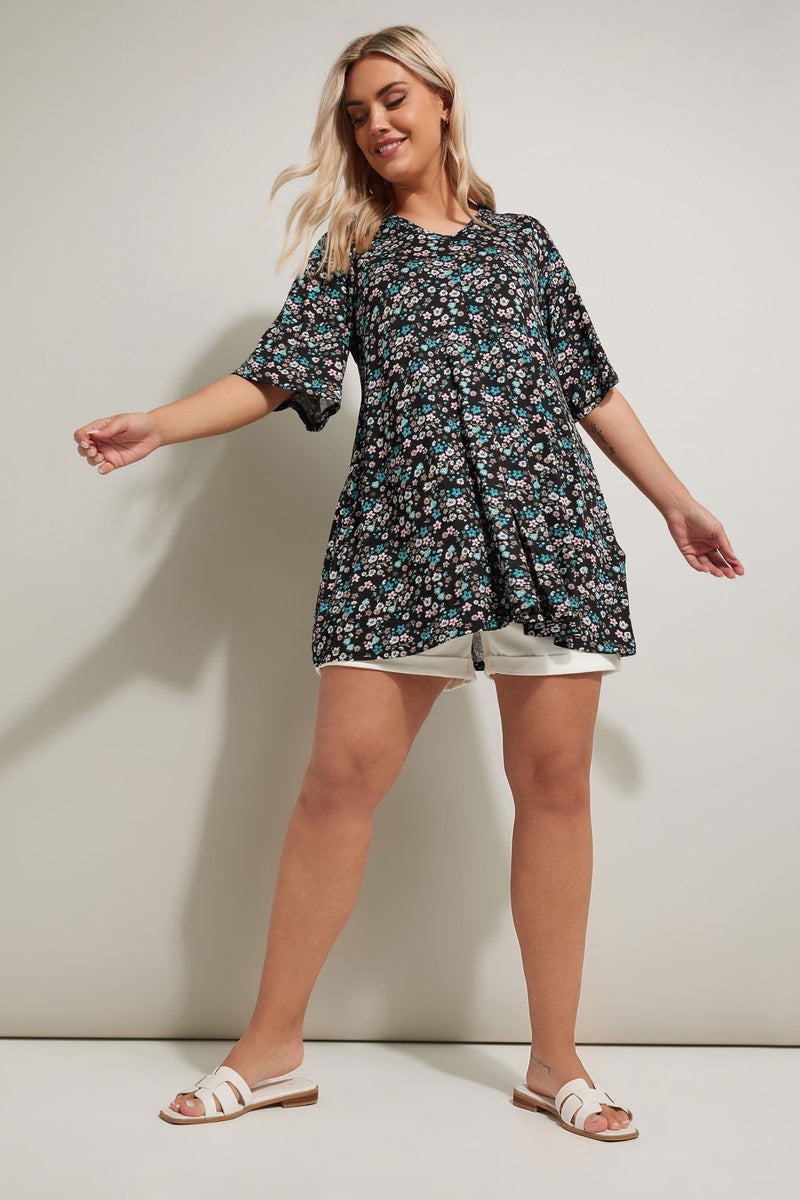 Büyük Beden V Yaka Sıfır Kol Çiçek Desenli Asimetrik Kesim T-shirt 304084