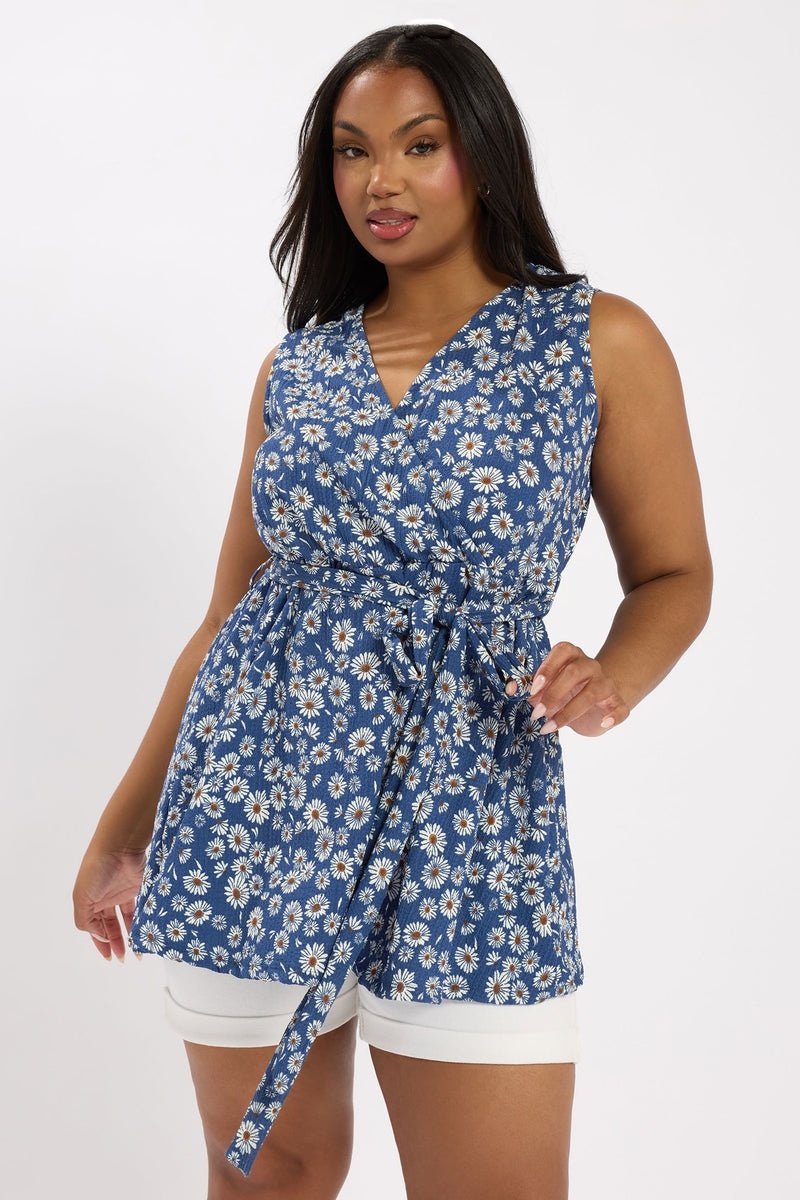Büyük Beden V Yaka Sıfır Kol Çiçek Desenli Kuşaklı Anvelop Bluz 322681