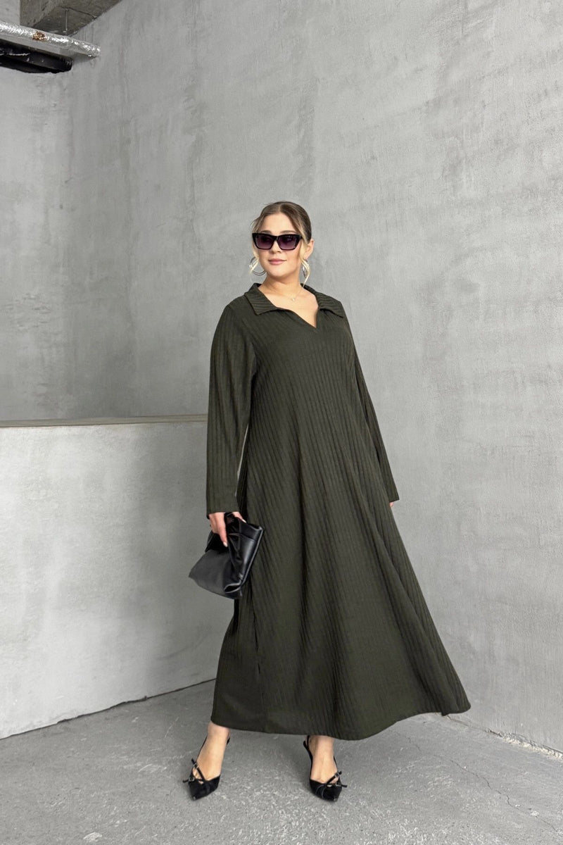 Büyük Beden V Yaka Uzun Kollu Fitilli Eteği Bollaşan Uzun Elbise 322182