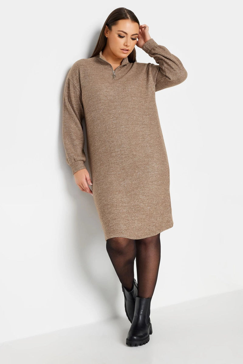 Büyük Beden Yakası Fermuarlı Uzun Kollu Midi Boy Elbise 321602