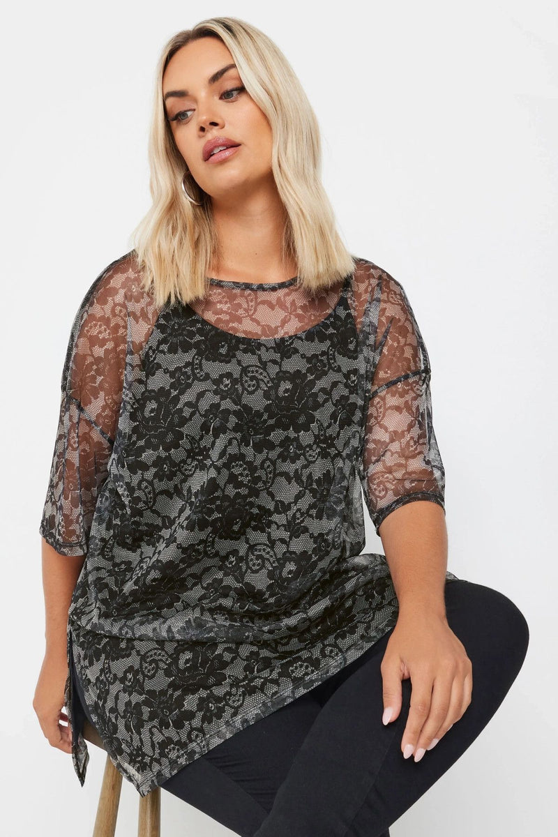• Büyük Beden Yarım Kollu İçi Astarlı Desenli Tül Bluz 303448