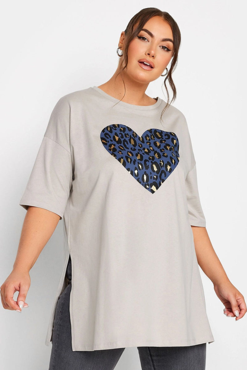 Büyük Beden Yırtmaç Detaylı Kalp Desenli Bisiklet Yaka Yarım Kol Bluz 321122